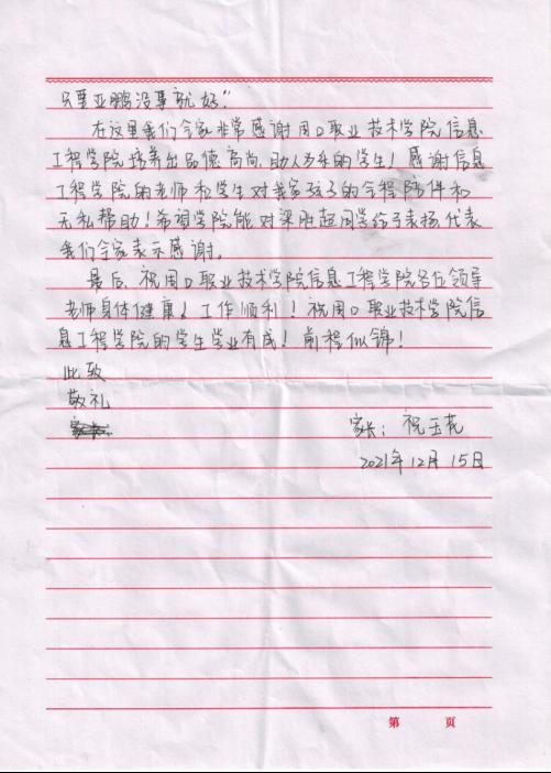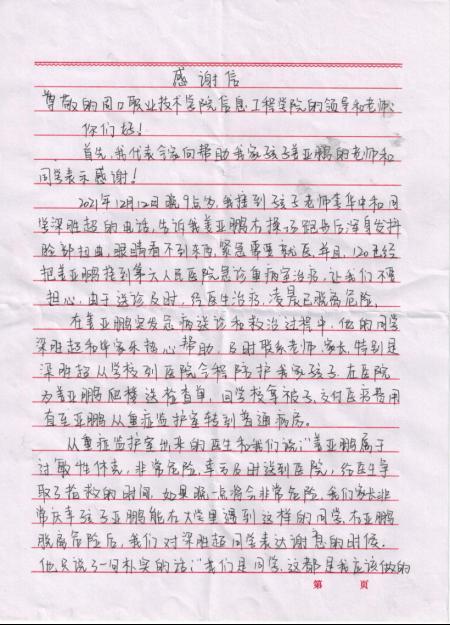 12月17日,Beat365官网收到一封来自2021级计算机应用技术二班学生家长祝玉花发来的感谢信。信中情感真挚的对Beat365中文官方网站老师李华中、同学梁胜超和毕家乐在其孩子生病期间给予的关怀与帮助表示由衷的感谢。