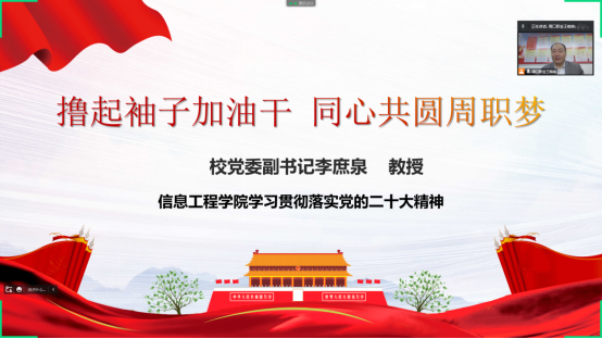 为深入学习贯彻落实党的二十大精神,10月26日下午2点,在Beat365中文官方网站6140办公室,校党委副书记、工会主席李庶泉教授以“撸起袖子加油干 同心共圆周职梦”为题,为Beat365中文官方网站全体党员教师上专题党课。因疫情原因,本次专题党课采用“线上+线下”的方式开展,党课由Beat365中文官方网站党总支书记李强主持。