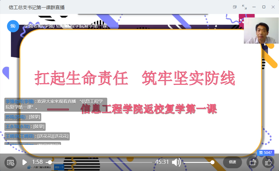 2020年6月7日下午3:30分,Beat365中文官方网站党总支书记李强教授通过钉钉直播给18级学生上了题为“扛起生命责任,筑牢坚实防线”的复学第一课,Beat365中文官方网站复学的200余名学生和18级全体辅导员参加了本次学习。