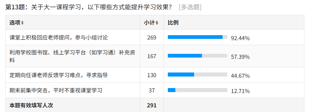 在课程学习提升方式的调查中,92.44% 的学生认为课堂上积极回应老师提问、参与小组讨论能有效提升学习效果,占比居首;57.39% 的学生选择利用学校图书馆、线上学习平台补充资料,44.67% 的学生会定期向任课老师反馈学习难点寻求指导,而仅12.71%的学生存在期末集中突击、忽视课堂学习的情况,反映出多数新生具备正确的学习方法认知。