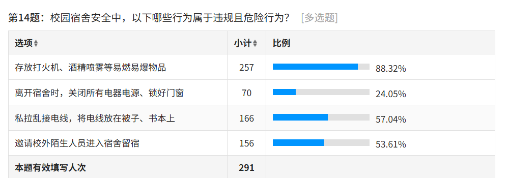 宿舍安全认知调查揭示,88.32% 的学生明确存放打火机、酒精喷雾等易燃易爆物品属于违规危险行为,57.04% 的学生知晓私拉乱接电线的危险性,53.61% 的学生认识到邀请校外陌生人员留宿的风险;但仅有24.05%的学生养成离开宿舍时关闭所有电器电源、锁好门窗的习惯,反映出新生在宿舍安全行为落实上仍有提升空间。
