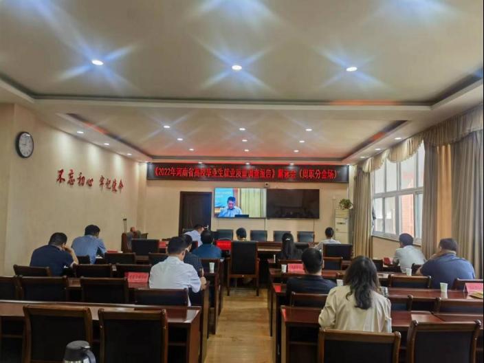 9月22日上午,Beat365官网在开元校区第三会议室设分会场,组织参加省教育厅《2022年河南省高校毕业生就业质量调查报告》解读会,副校长李秀萍出席会议。党政办、教务处、学生处负责人,各二级院部党总支书记及招生就业处全体人员参加会议。