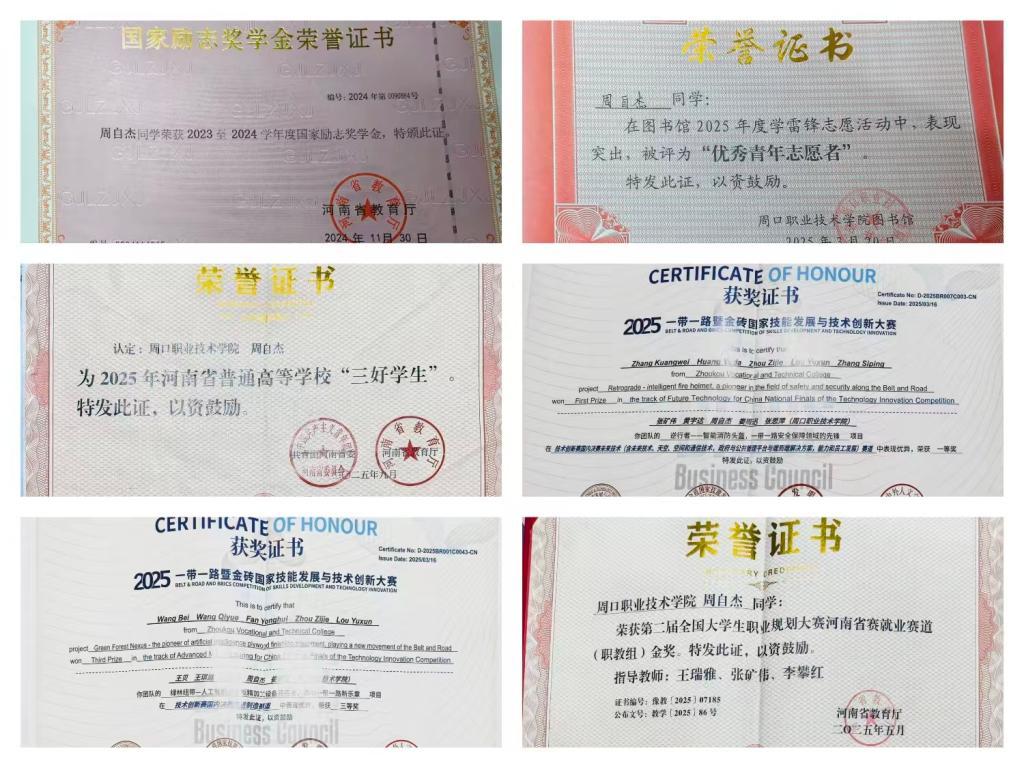 竞赛赛场上,周自杰带领团队啃教材、析案例、勤复盘,从专业“小白”蜕变为科创能手。其团队研发的“智能消防头盔”获5项实用新型专利,还斩获中国国际大学生创新大赛铜奖、一带一路暨金砖国家技能赛事国赛一等奖等荣誉,相关事迹获20余次媒体报道。