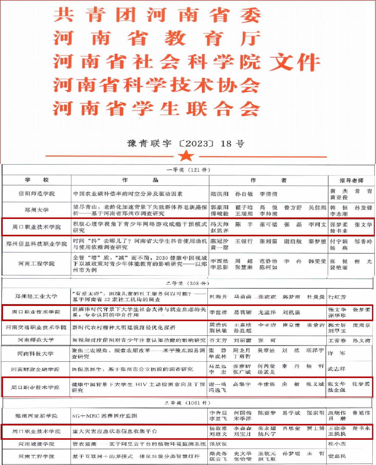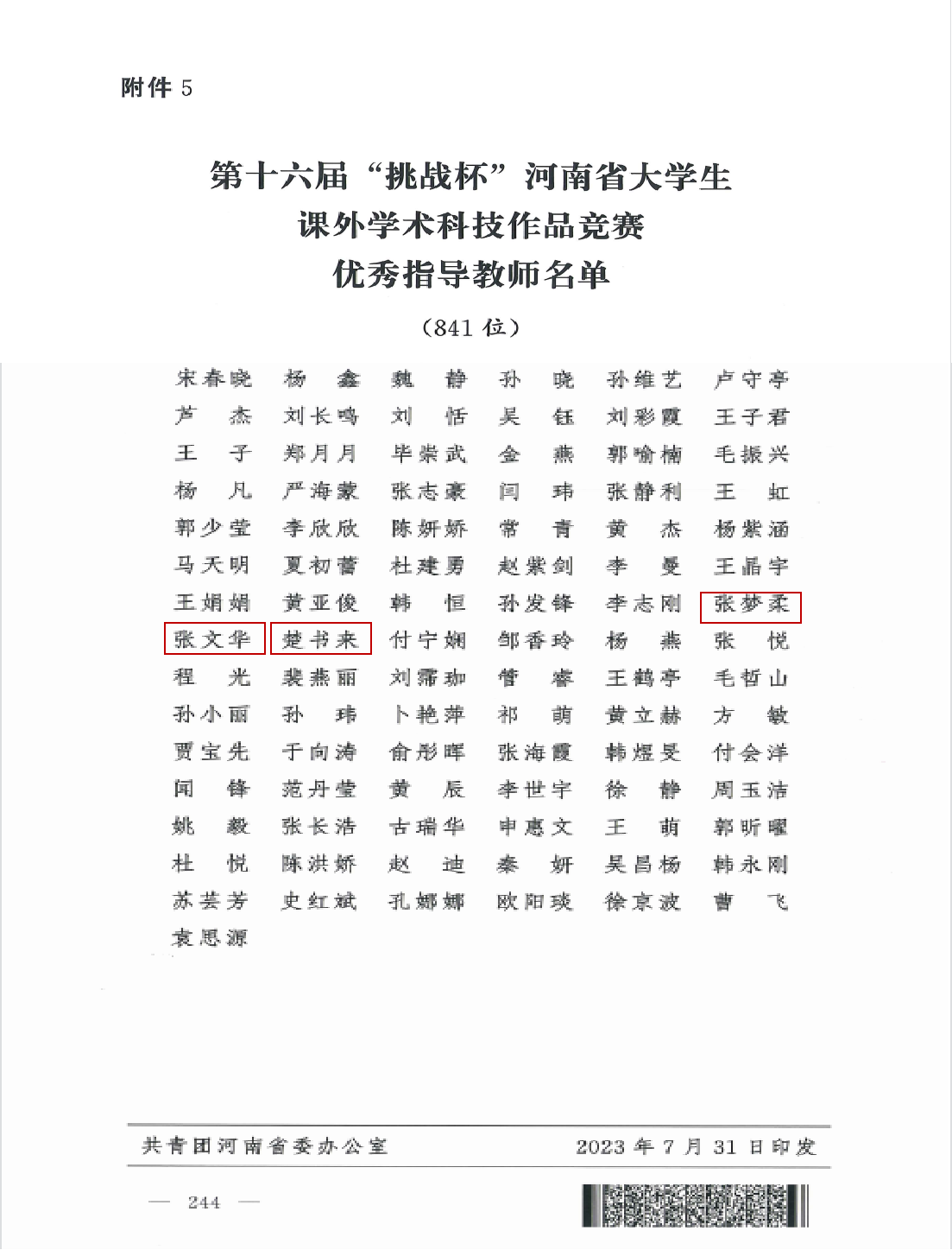 近日,由共青团河南省委、省教育厅、省社会科学院、省科学技术协会、省学联共同主办的第十六届“挑战杯”河南省大学生课外学术科技作品竞赛圆满结束。自接到大赛通知以来,Beat365中文官方网站高度重视、积极宣传、广泛发动,最终喜获一等奖1项、二等奖2项、三等奖1项,张梦柔、张文华、楚书来三位老师被评为优秀指导老师,获奖数量创历史新高。