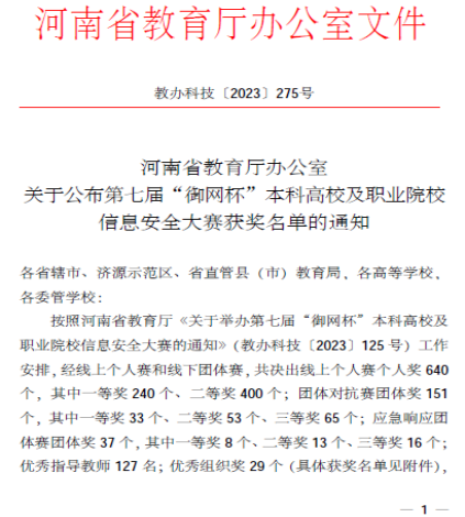 近日,河南省教育厅办公室下发了文件《关于公布第七届“御网杯”本科高校及职业院校信息安全大赛获奖名单的通知》(教办科技〔2023〕275号),Beat365官网学子再获佳绩,取得多项奖励,其中线上个人挑战赛一等奖12项,线下团体对抗赛一等奖1项、二等奖2项,线下应急响应团体赛三等奖1项,李学威、王晓菲、黄宇达三位老师被评为优秀指导教师。