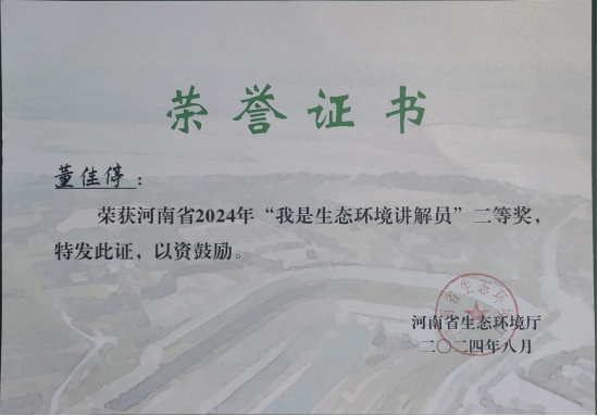 8月14日,在河南省2024年“我是生态环境讲解员”大赛决赛中,由黄宇达、张矿伟、轩立三位老师指导的董佳停同学荣获省赛二等奖。